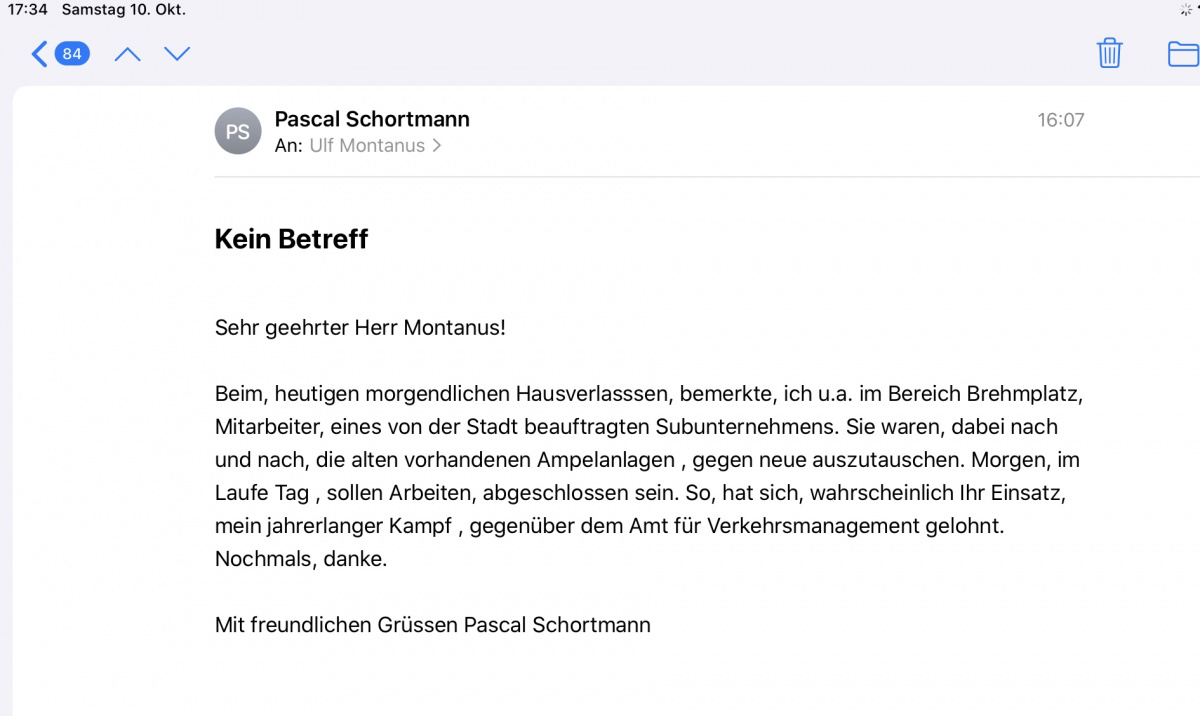 Es ist mehr als erfreulich, wenn sich ein Antrag gelohnt hat, dieser umgesetzt wird und sich die Person, die einen um Hilfe am Wahlkampfstand gebeten hat, dieses erkennt und sich bedankt und über die ergriffenen Maßnahmen freut.
